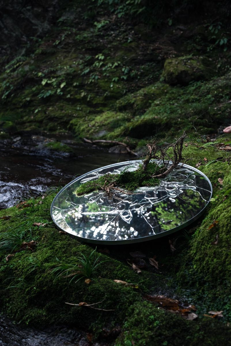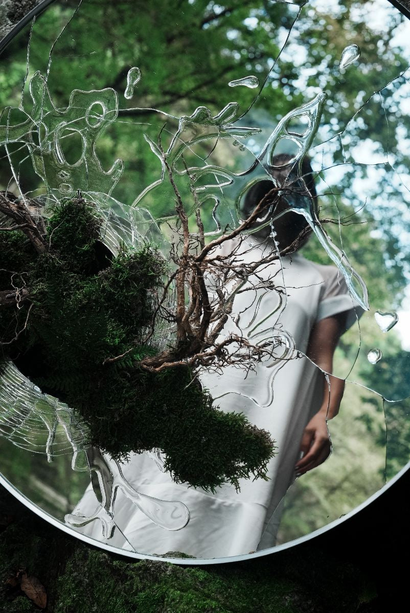 今回の個展では、「生命の色」をテーマとしており、鏡の中に映し出された自身の過去を叩き割り、その割れた隙間から湧き出て解放されていく水や樹木を新たな自分に準え、作品に昇華しています。